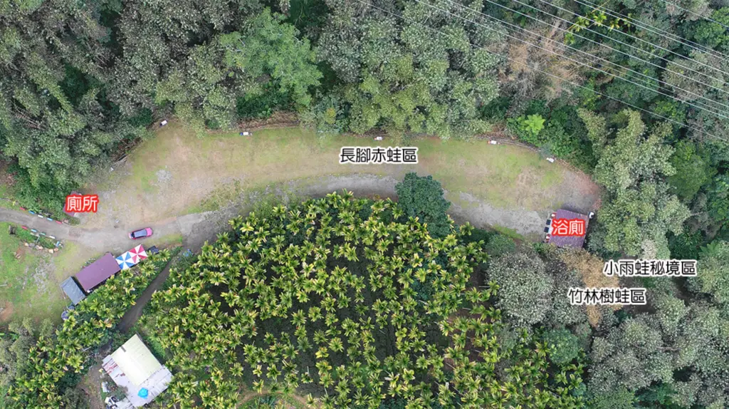 營區主要分成三個部分 長腳赤蛙區 小雨蛙秘境包區 及 樹林竹蛙包區
